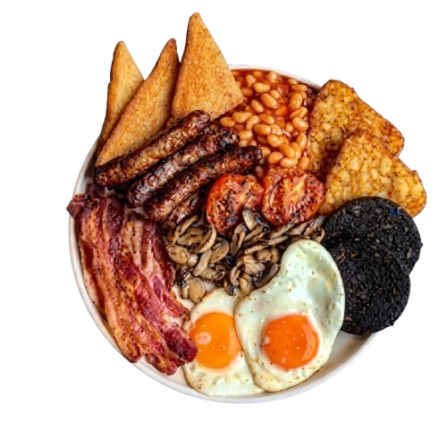 A hearty plate with eggs, sausages, bacon, toast, and beans to start your day right.